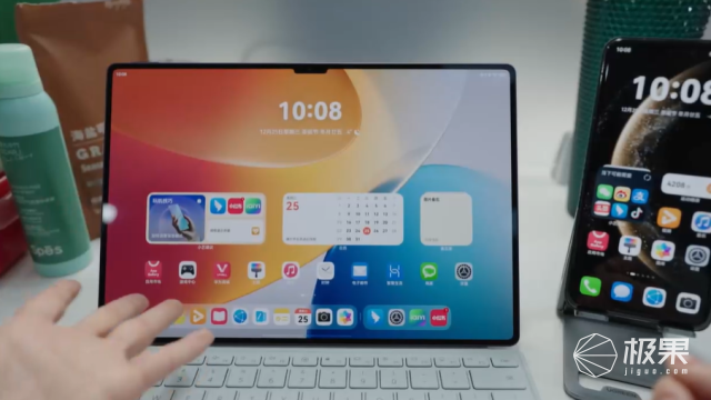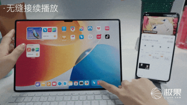 大家看我的演示,手机靠近平板,App图标就自动在平板dock栏弹出,接着点击接续播放,然后拖动顶部无级缩放,就能轻松大屏观影了。